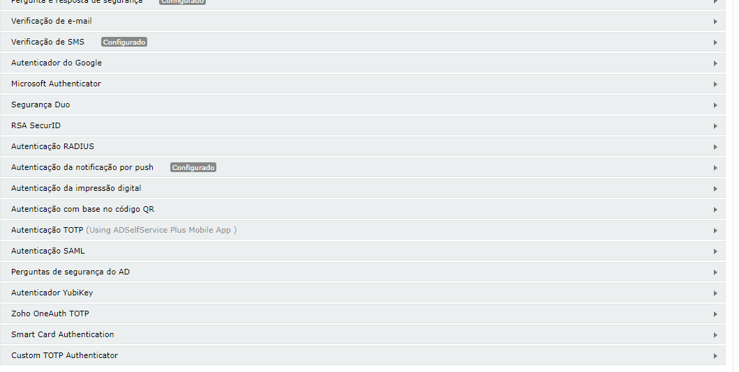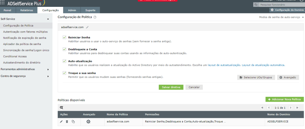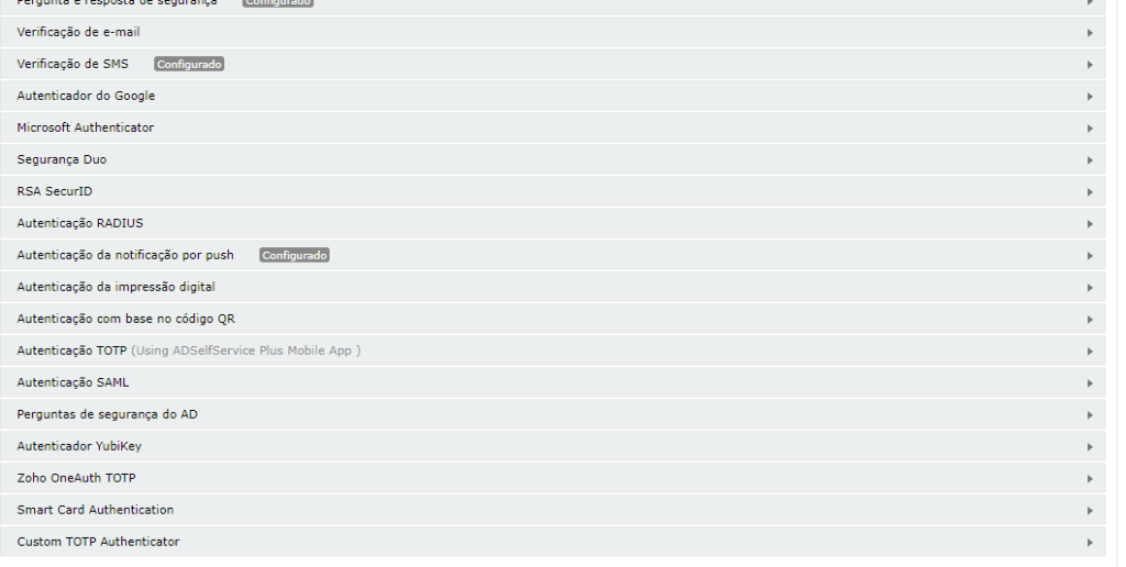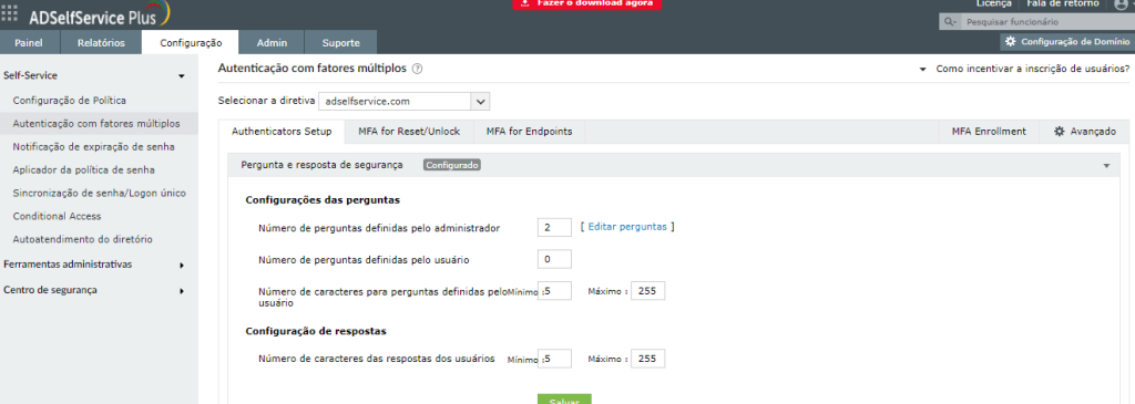 Com ele é possível criar políticas específicas para OUs ou grupos específicos. Habilite as perguntas de segurança e múltiplos fatores de autenticação com o Google Authenticator, Microsoft, perguntas do AD, SMS, entre outros: