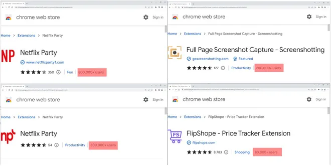 Foi identificado que um conjunto de cinco extensões criminosas para o Google Chrome era parte de um esquema fraudulento de pagamentos a afiliados em diversas plataformas internacionais de e-commerce, elas acumulam mais de 1,4 milhões de downloads. Tais plug-ins se passavam por utilitários, ou ferramentas para sessões de grupos da Netflix, ou até mesmo rastreadores de preços para acompanhar o usuário e com isso inserir de forma fraudulenta códigos de associação, isso acontecia sempre que era detectada as compras em site compatíveis.