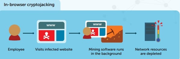 Criptojacking é o processo de usar a computação da vítima como recurso para minar criptomoedas sem o seu conhecimento.