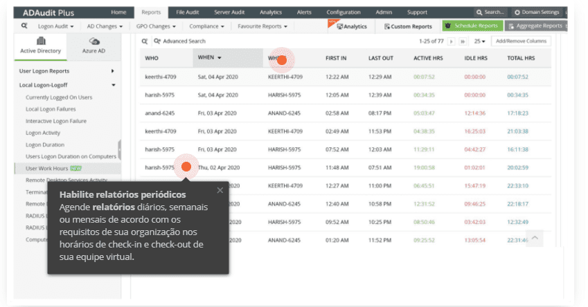 Avalie o número de funcionários trabalhando remotamente, monitorando seus dados completos de login da força de trabalho para tipos de login interativo em cache. Audite e analise quem está conectado atualmente e há quanto tempo eles trabalharam por dia, junto com detalhes sobre os tempos de inicialização e desligamento do sistema.