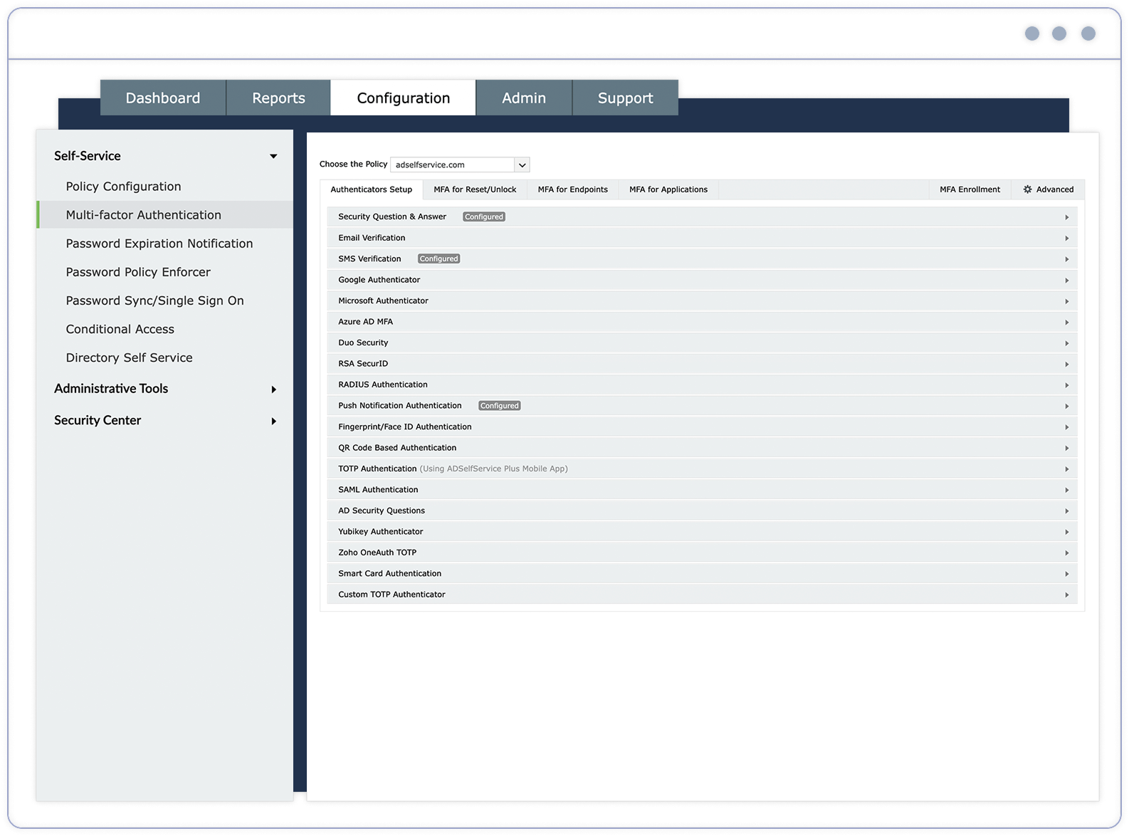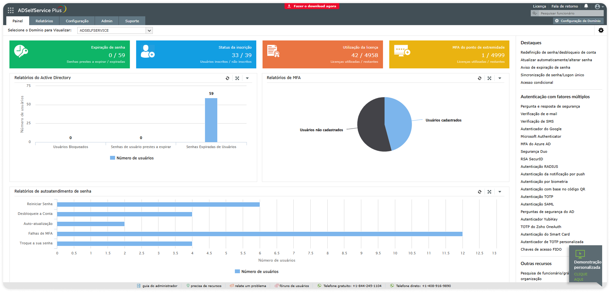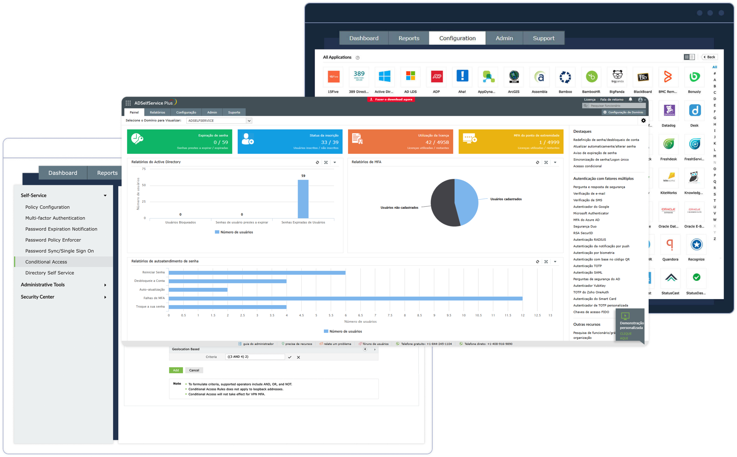 Com o ADSelfService Plus, você pode proteger os seus recursos, incluindo identidades, máquinas e VPN, reduzir a carga nos help desks de TI, capacitar os usuários com recursos de autoatendimento e obter visibilidade e controle de 360 graus sobre identidades espalhadas em ambientes on-premises, na cloud e híbridos.