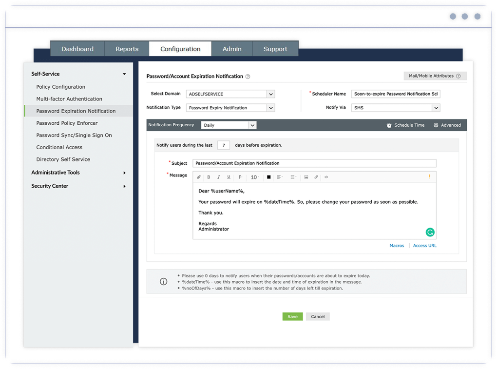 Evite interrupções operacionais alertando os usuários sobre senhas prestes a expirar via e-mail, SMS ou pop-up, com links diretos para redefinição.