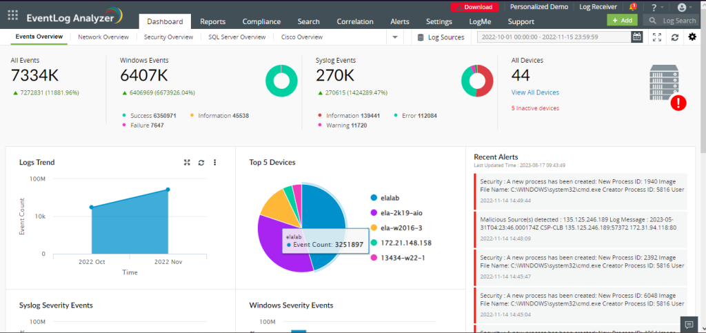 Nesse contexto, ferramentas como o EventLog Analyzer da ManageEngine desempenham um papel crucial. Ao permitir a coleta e análise centralizada de logs de diversas fontes, essa ferramenta possibilita a correlação inteligente de eventos em tempo real. Isso impulsiona a detecção proativa de atividades anômalas, a geração de alertas automatizados e a investigação mais detalhada de incidentes. A visualização e o relatório eficazes também facilitam a compreensão das tendências de segurança, auxiliando na tomada de decisões informadas.