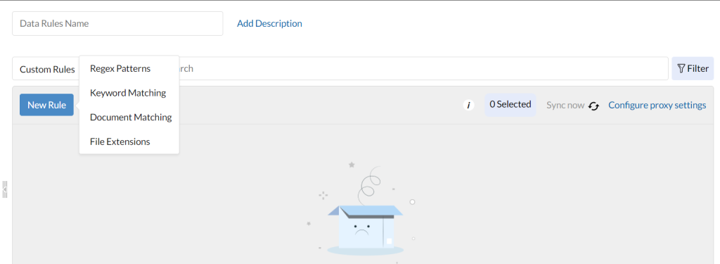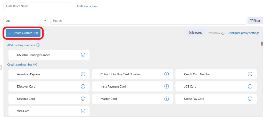 As regras de dados são conjuntos de dados que fazem parte de categorias como Finanças, Saúde, PII, entre outros, que podem ser sinalizados como confidenciais e assim serem impedidos de serem transferidos sem autorização, com isso podem ser regras predefinidas ou personalizadas. Vamos para os passos a seguir de como criar uma nova regra predefinida: