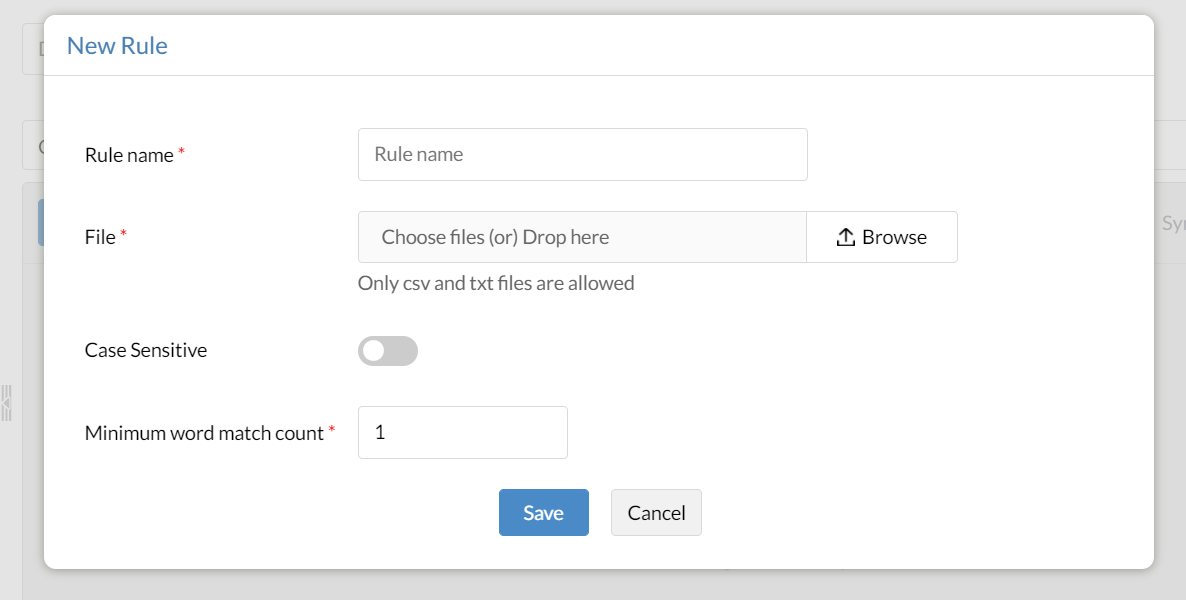 4 – Adicione nome, arquivo da palavras-chave, distinção entre maiúsculas e minúsculas e contagem de correspondências para uma regra com base na correspondência de palavras-chave.