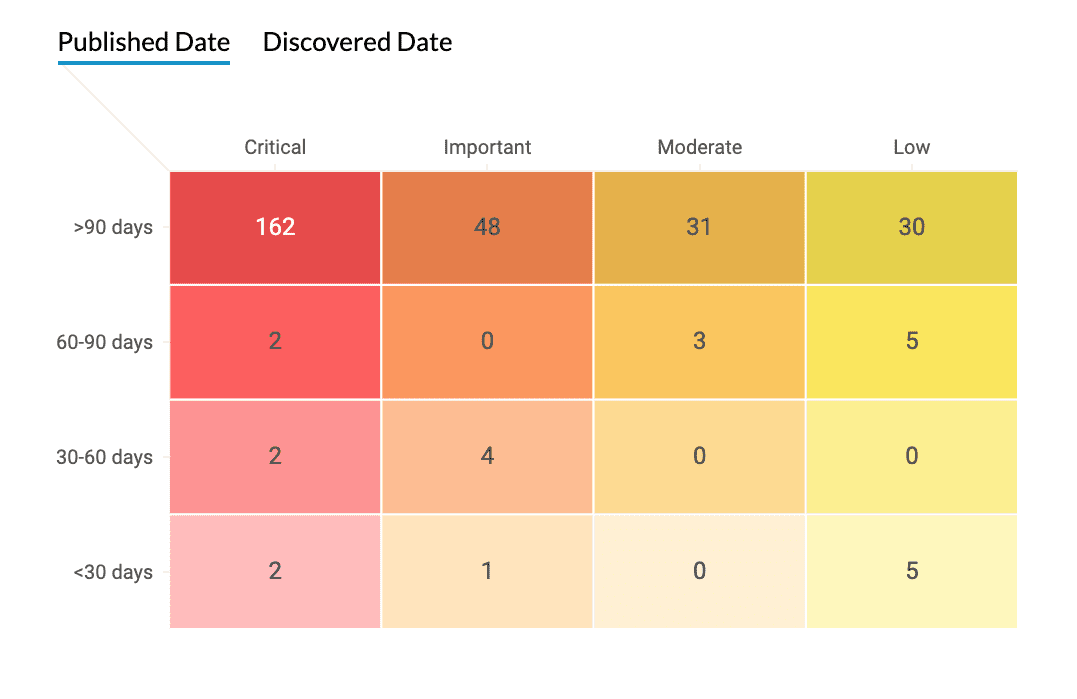 A Vulnerability Age Matrix oferece uma visão consolidada da idade e gravidade das vulnerabilidades, para que você possa concentrar sua atenção nas vulnerabilidades que precisam ser eliminadas antes do prazo. Você pode escolher visualizar a idade da vulnerabilidade a partir do dia em que é publicado ou a partir do dia em que é descoberto em sua rede. Você também pode usar o filtro para exibir apenas vulnerabilidades que possuem exploits públicos.