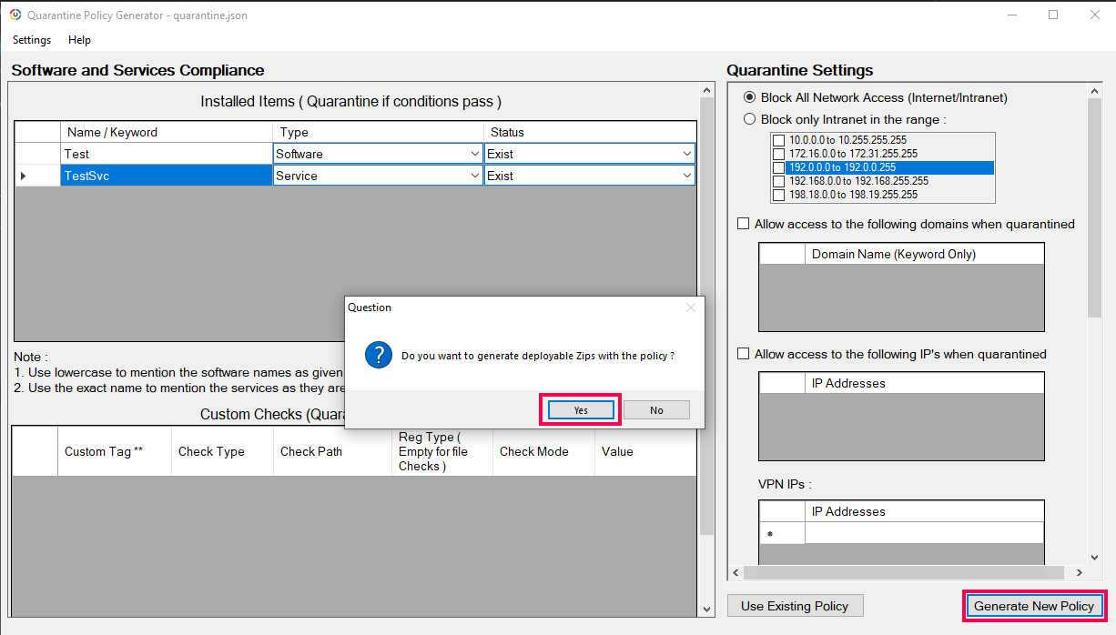 - Abra a ferramenta Quarantine Policy Generator (QuarantinePolicyGenerator.exe) e assim crie políticas conforme as regras da sua organização. A política pode ser criada com base em: – verificações de software, verificações de serviço, verificações personalizadas, verificações de patches, verificações de caminho de registro. Verificações de caminho de arquivo e verificações de versão de arquivo.