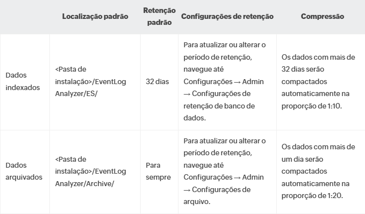 Os registros de log são armazenados no banco de dados, passando por processos periódicos de compactação e arquivamento em arquivos compactados. Quanto mais longo for o período de retenção no banco de dados, maior será a demanda por espaço no disco rígido, o que pode resultar em um desempenho inferior do banco de dados.