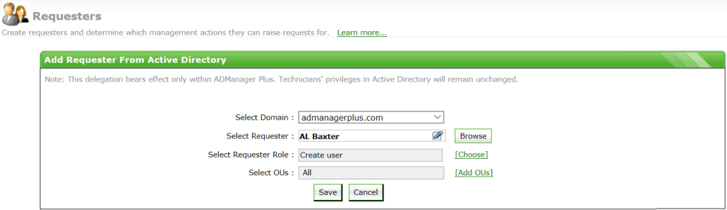 Depois de criar um papel, adicionar um novo solicitante ou atribuir a um técnico de help desk existente, uma ou mais funções. Você pode fazer isso indo até a guia Fluxo de trabalho e clicando em Solicitantes . Usando a restrição baseada em OU, você pode limitar o escopo de atividades designadas de um solicitante a uma ou algumas OUs (ou seja, um técnico só pode criar usuários ou redefinir senhas dentro de suas OUs atribuídas).