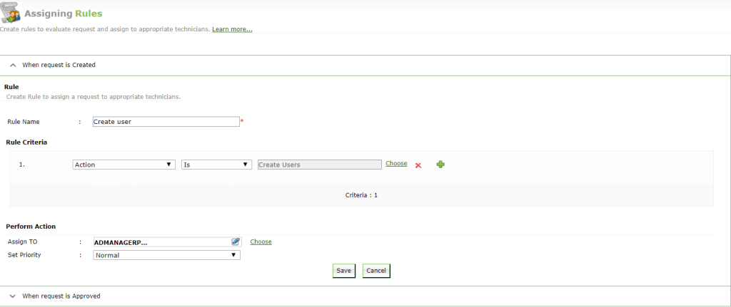 A atribuição de regra adequada garante que, uma vez que uma solicitação seja criada, ela seja automaticamente atribuída a outro técnico para o próximo nível de aprovação. Isso cria as verificações e os balanços necessários para impedir que solicitações não autorizadas sejam executadas porque a solicitação precisa passar por uma cadeia de aprovação. Quando você estiver pronto para atribuir uma nova função, vá para Atribuição de regras e clique em Adicionar nova regra .