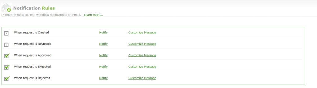 Defina as regras para envio de notificação por email e SMS após cada etapa de processamento da solicitação, ou seja, quando a solicitação é criada, revisada, aprovada, executada ou rejeitada.