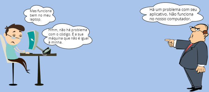 O aplicativo funciona bem em nosso laptop, mas não funciona no servidor de produção ou na máquina de um usuário devido à diferença na computação do ambiente entre os dois.