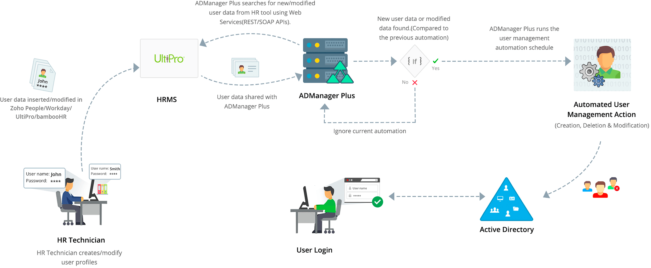 A integração ADManager Plus-UltiPro resolve esse problema sincronizando o banco de dados do Active Directory com o banco de dados HRMS.