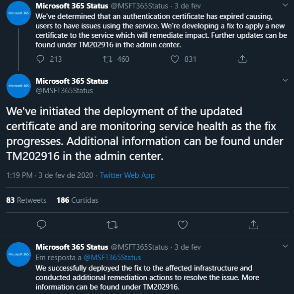 A Microsoft admitiu via Twitter que havia identificado o problema como um certificado de autenticação expirado que não havia sido renovado.