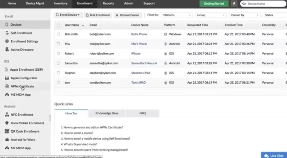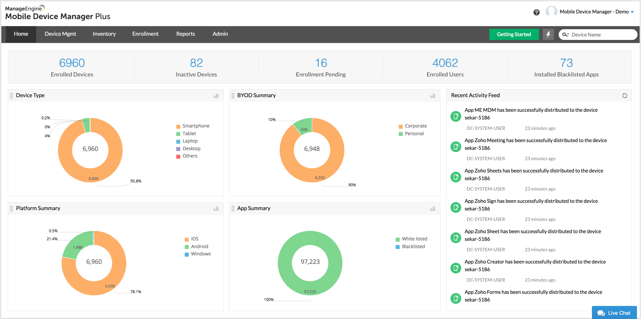 ManageEngine Mobile Device Manager Plus é uma solução abrangente de gerenciamento de dispositivos móveis projetada para capacitar a força de trabalho da sua empresa com o poder da mobilidade, aumenteo a produtividade dos funcionários sem comprometer a segurança corporativa. Permite gerenciar smartphones, laptops, tablets e desktops, TVs, dispositivos robustos e vários sistemas operacionais, como iOS, Android, Windows, macOS e Chrome OS.