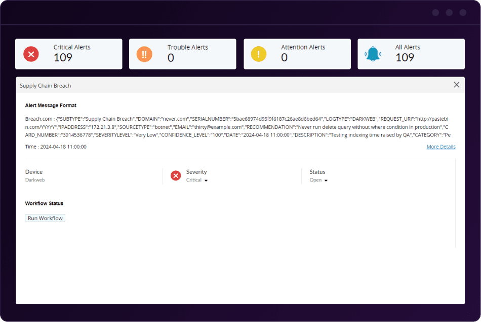 O Log360 utiliza ferramentas avançadas para coletar dados na dark web, verificando a precisão e enriquecendo essas informações com indicadores de ameaças. Esse processo resulta em alertas acionáveis, permitindo respostas rápidas e eficazes a ameaças identificadas.
