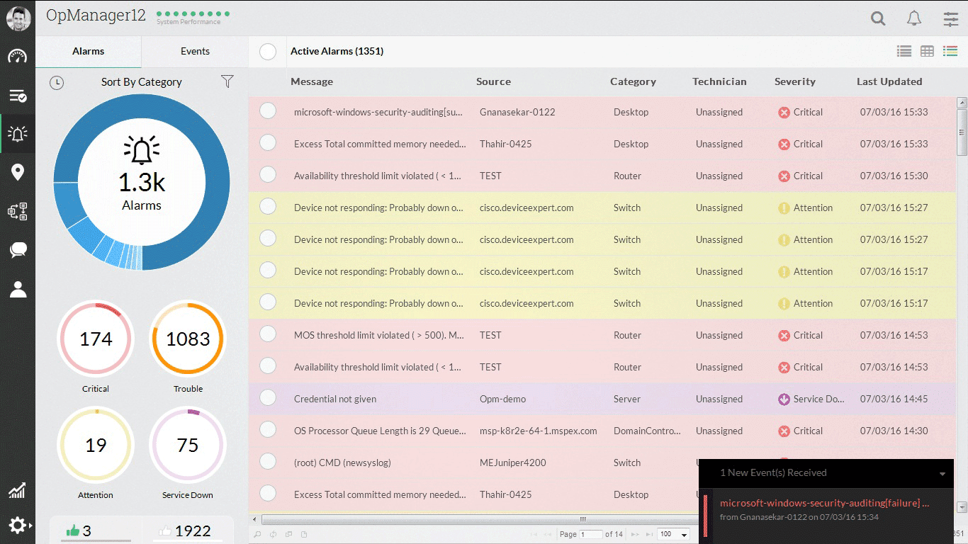 O OpManager realiza processamento inteligente de eventos. Ele correlaciona eventos de rede brutos, filtra eventos indesejados e apresenta apenas alarmes significativos para o operador. Suporta alarmes codificados por cores que são apresentados num formato de fácil utilização. Os administradores podem visualizar o histórico de eventos associado a um alarme e limpar ou excluir manualmente os alarmes.
