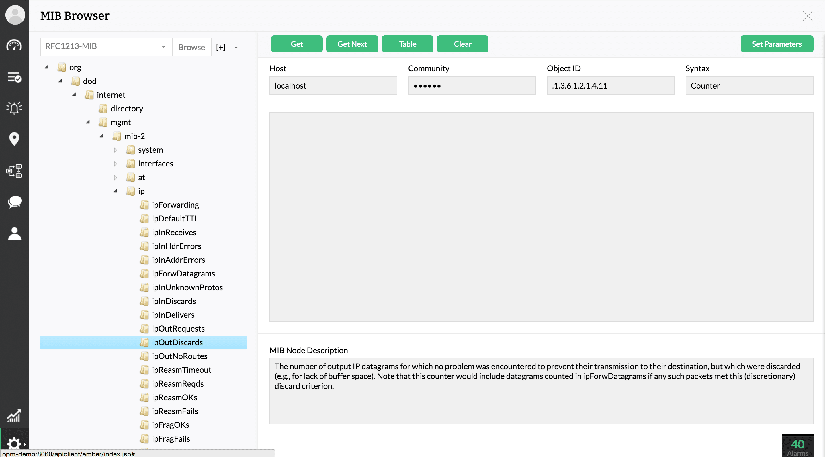 O OpManager suporta vários mecanismos de alerta e pode alertar um operador quando um dispositivo ou serviço é desativado. O OpManager também pode ser configurado para alertar os operadores quando um serviço ou um contador de verificação de integridade em um dispositivo exceder ou ultrapassar um determinado limite. Os operadores também podem adicionar suporte para traps de qualquer MIB SNMP personalizada. O OpManager pode extrair informações úteis que são enviadas com traps SNMP como ligações variáveis. (SNMP varbinds)