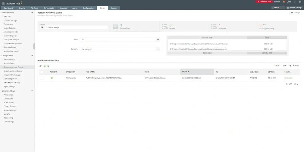 É possível armazenar por tempo indeterminado todo o histórico do seu AD, com execução de arquivamento periódico de dados de eventos auditados para economizar espaço em disco. Acesse relatórios de eventos passados, como usuário, histórico de logon no Active Directory, histórico de alteração de senha dentre outros partindo do diretório de dados de auditoria arquivados. Os relatórios auditados podem ser exportados para os formatos csv, xls, pdf e excel.