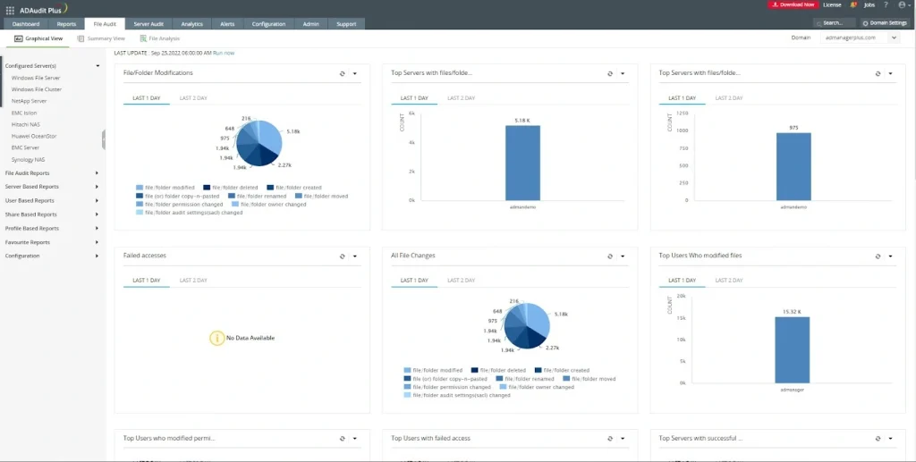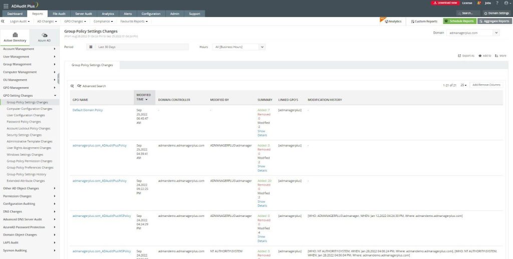 Com o ADAudit Plus da ManageEngine é possível reunir e analisar toda a informação de uso do Active Directory e com isso identificar com facilidade os focos de anomalias no uso de privilégios, com a opção de envio de alestas e geração de histórico que permitirá a execução da auditoria do ambiente. Sendo assim os recursos críticos como os controladores de domínio são auditados, monitorados e relatados, gerando informações sobre objetos do Active Directory.