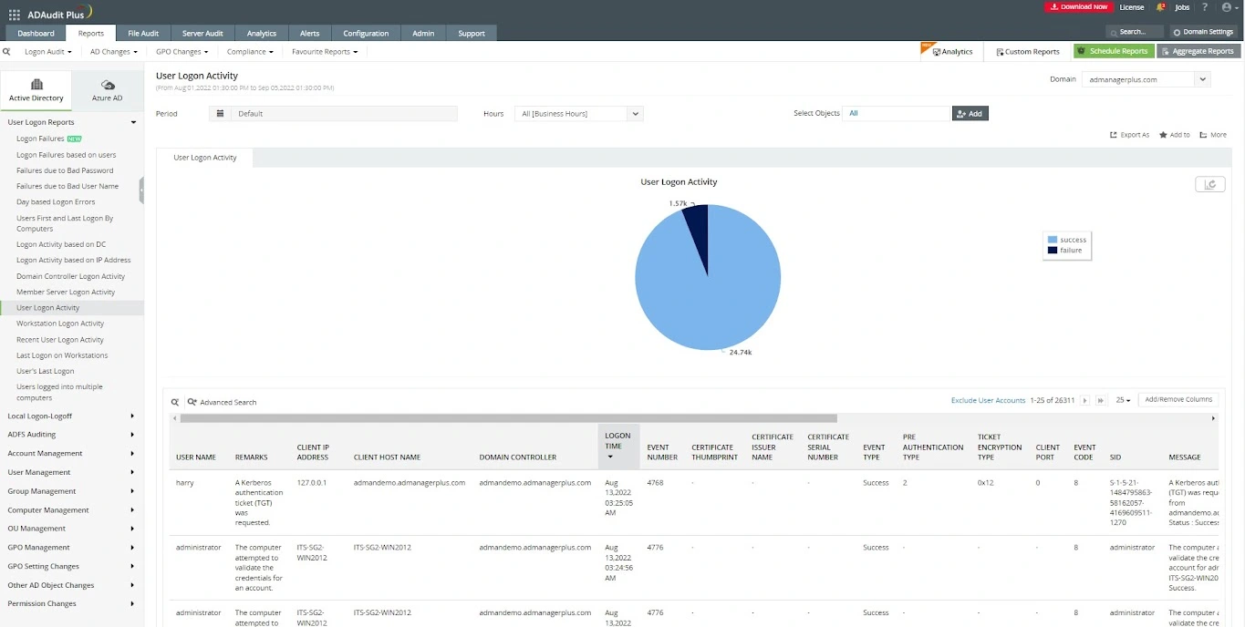 Ponto extremamente importante, é possível monitorar as atividades de logon dos usuários em controladores de domínio utilizando relatórios de auditoria pré-configurado e a partir daí gerar emails de alerta. Com a ajuda dos relatórios de auditoria o gestor do ambiente saberá por qual razão falhas de logon estão ocorrendo e todo o histórico de login, além das atividades de serviços de terminal e atividades recentes de logon de usuários na rede.