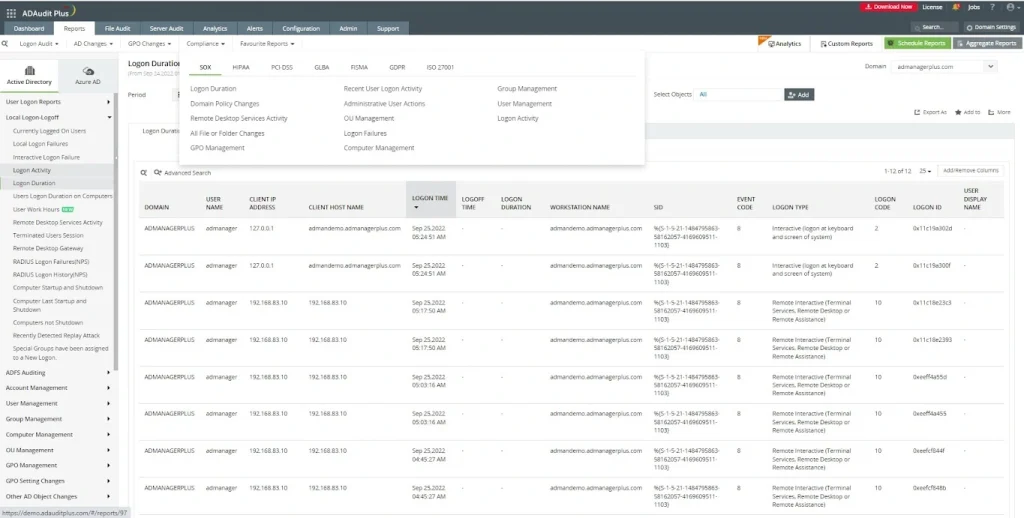 Nunca se usou tanto esse termo nos ambientes de TI, portanto dentro do ADAudit não seria diferente, é possível obter relatórios pré-definidos com compliance específicas como SOX, HIPAA, GLBA, PCI-DSS, FISMA, GDPR, ISO 27001.
