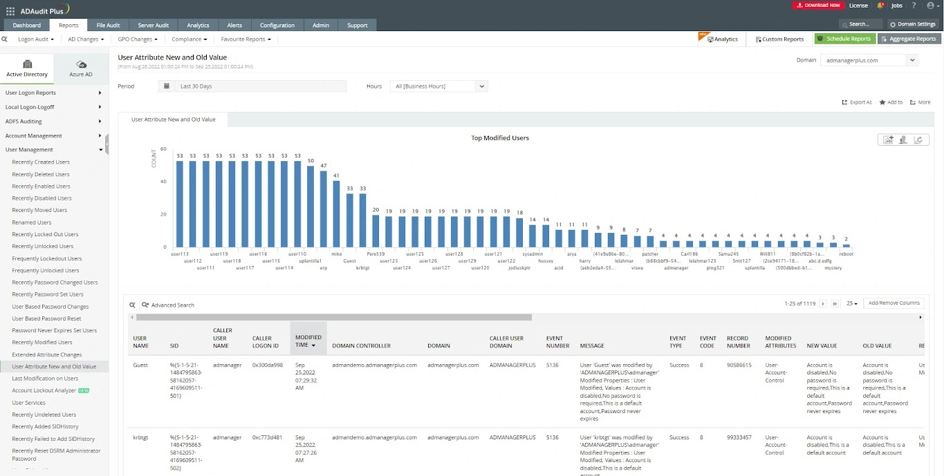 Realize a auditoria do antes e depois dos valores dos atributos de todas os objetos do AD. E tenha ciência de todas as mudanças em usuários, Computadores, Grupos, GPO e OU, mantendo-se ciente das tentativas não autorizadas com alertas para cada modificação , permissão e atributos, realize o monitoramento e visualize os relatórios pré-definidos.