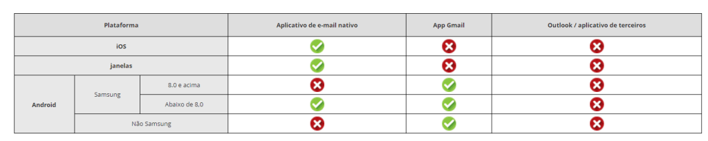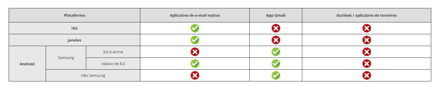 - A política CEA concede acesso apenas a clientes de e-mail configurados usando o perfil Exchange ActiveSync no MDM. Consulte a tabela abaixo para obter a lista de clientes de e-mail compatíveis com o CEA. Os clientes de e-mail marcados com contas cruzadas e corporativas configuradas manualmente pelo usuário em dispositivos gerenciados serão bloqueados.
