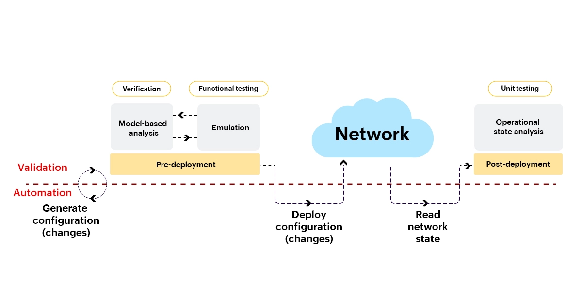 Seguindo todos os processos temos tem abordagens para a validação de rede, que inclui a analise baseada em modelo, que descreve o comportamento das redes em cenário variados aplicando configurações específicas por meio de simulação e matemática abstrata. Seguido da emulação que é um banco de testes para os engenheiros de rede possam usar para para implantar e checar configurações com segurança e assim poderá seguir para analise de estado operacional onde os engenheiros de rede enviam alterações às configurações de rede e checam se elas estão funcionando com a finalidade desejada, como por exemplo: se a configuração do roteador recém-configurado fez qualquer processo pretendido.