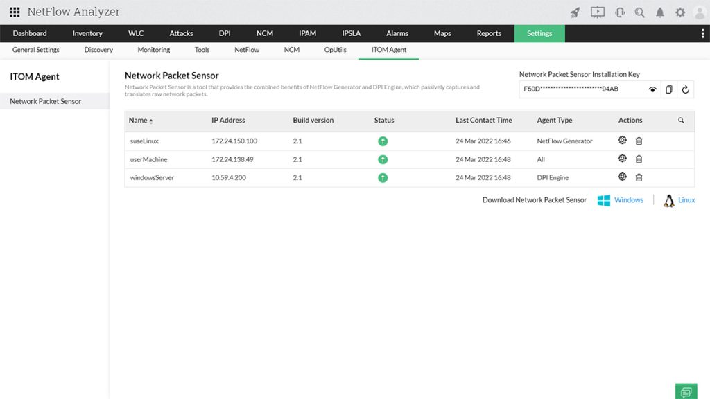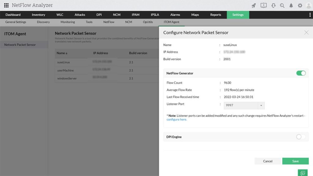 O NetFlow Analyzer da ManageEngine agora possui um novo recurso de visibilidade detalhada do tráfego de rede: o Network Packet Sensor que utiliza ambos os métodos de análise de fluxo e captura de pacotes. Fornecendo informações detalhadas do ponto de falha, seja na rede, servidor ou aplicação. Combinando as funções do NetFlow Generator e da inspeção profunda de pacotes (DPI), o Network Packet Sensor poderá ser configurado como um NetFlow Generator, uma Deep Packet Inspection ou ambos, a depender do seus requisitos.