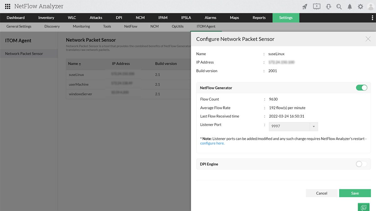 O NetFlow Analyzer da ManageEngine agora possui um novo recurso de visibilidade detalhada do tráfego de rede: o Network Packet Sensor que utiliza ambos os métodos de análise de fluxo e captura de pacotes. Fornecendo informações detalhadas do ponto de falha, seja na rede, servidor ou aplicação. Combinando as funções do NetFlow Generator e da inspeção profunda de pacotes (DPI), o Network Packet Sensor poderá ser configurado como um NetFlow Generator, uma Deep Packet Inspection ou ambos, a depender do seus requisitos.