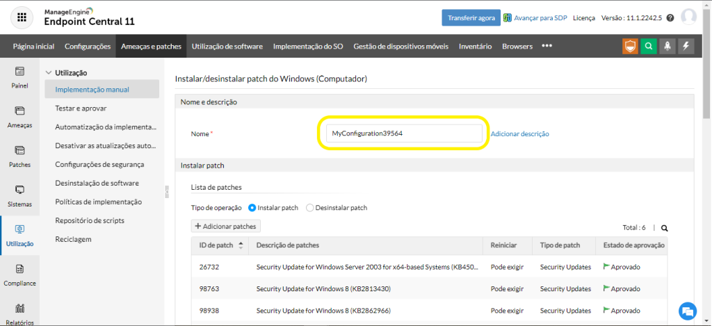 Crie uma configuração para implantar os patches ausentes, seguindo os passos abaixo: