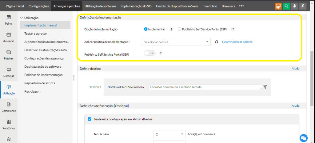 2 – Segunda opção (SSP) destacada na imagem abaixo, envia os patches selecionados para o Portal de autoatendimento (SSP), de onde os usuários finais podem iniciar a instalação.