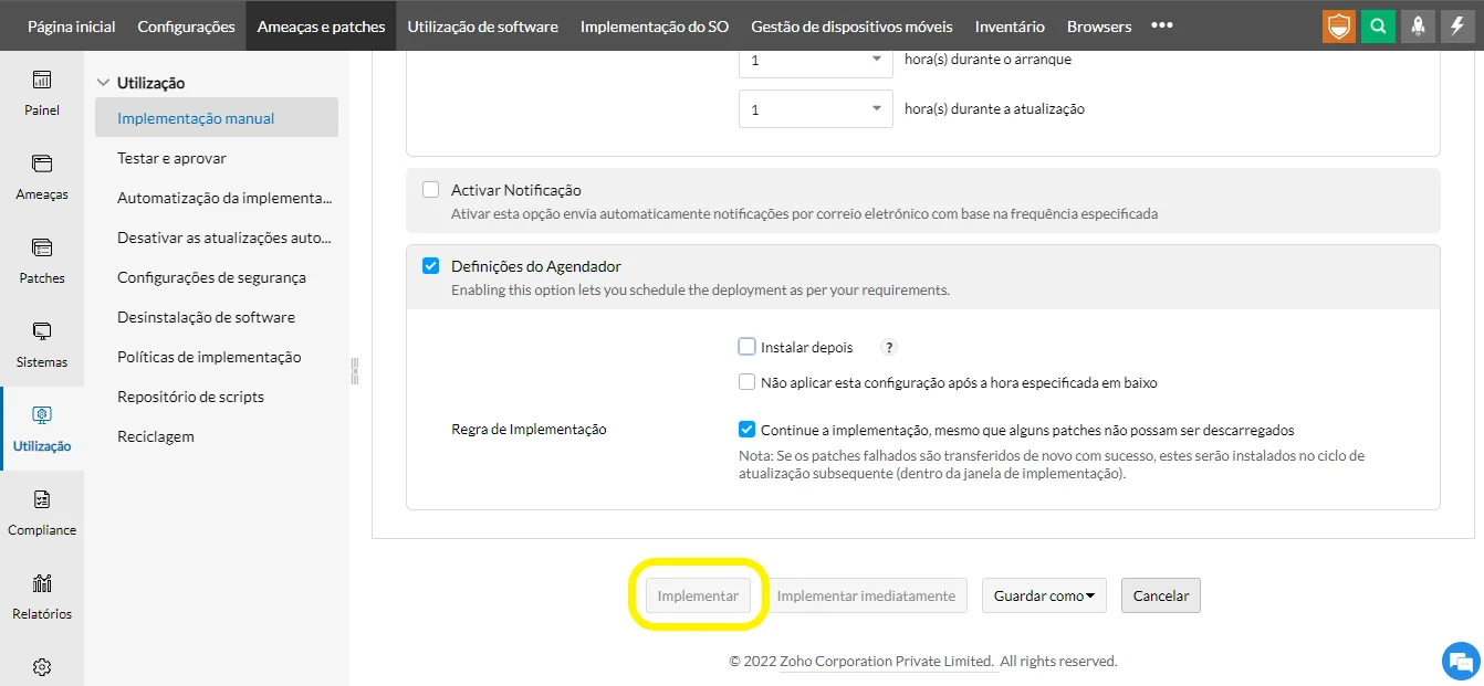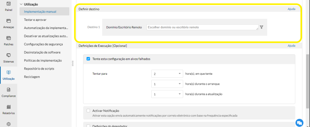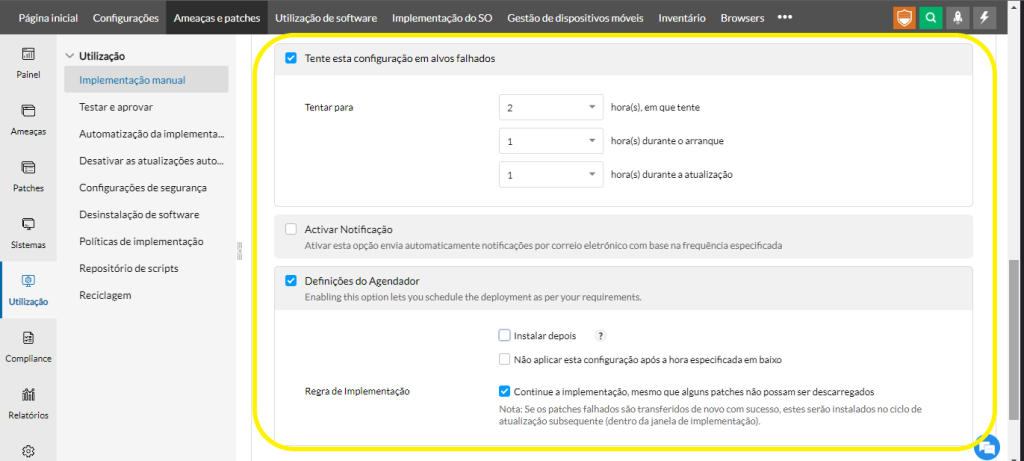 1 – A opção marcada por padrão na imagem abaixo implanta os patches selecionados nos computadores de destino. O usuário final não é informado disso, a menos que as configurações de notificação sejam definidas.
