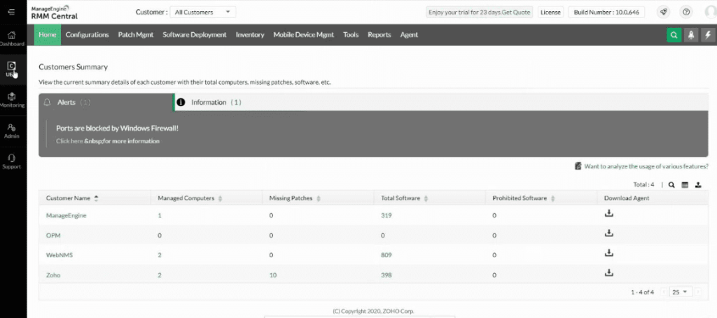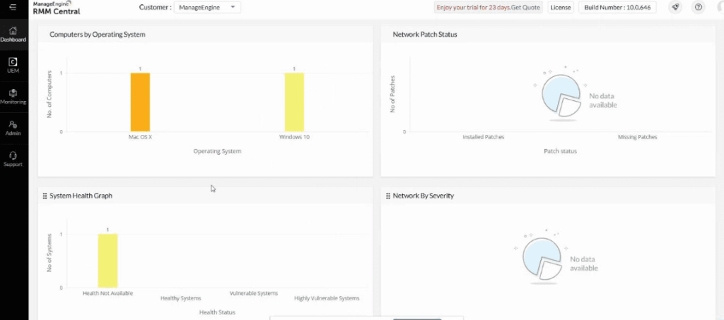 O RMM Central da ManageEngine é implementada com a ajuda de um agente. Eles se alimentam de informações relacionadas à saúde do computador e da rede.