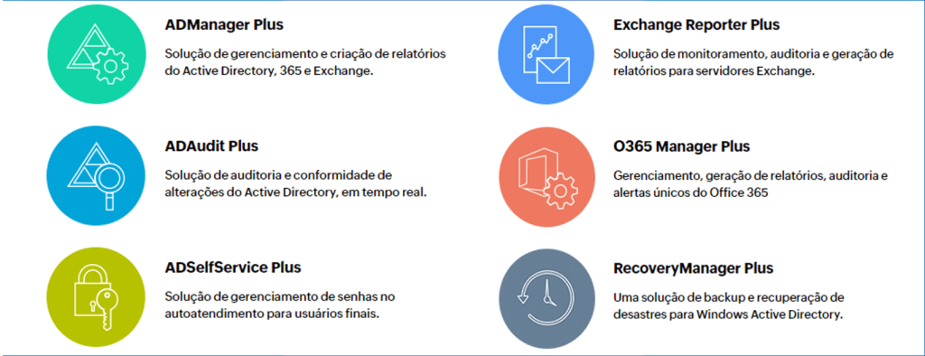 AD360 é uma solução integrada que compreende ADManager Plus, ADAudit Plus, ADSelfService Plus, Exchange Reporter Plus, O365 Manager Plus e RecoveryManager Plus. Com o AD360, basta você escolher os módulos que precisa e começar a resolver desafios de IAM e segurança no local, na nuvem e em ambientes híbridos a partir de um único console.