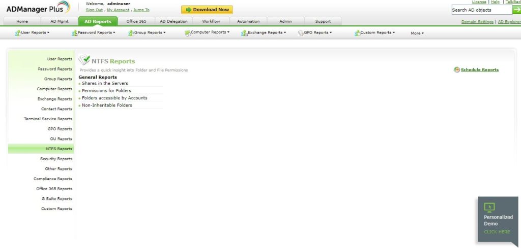 O relatório de permissões NTFS e de compartilhamento do ADManager Plus ajuda os administradores a gerar relatórios sobre permissões de acesso para arquivos e pastas compartilhadas e NTFS, para que eles possam auditar e certificar o acesso a dados confidenciais. Com essa ferramenta, os administradores também podem definir permissões NTFS refinadas com restrições de acesso baseadas em usuário e grupo para garantir que não haja acesso excessivamente permissivo a arquivos confidenciais.