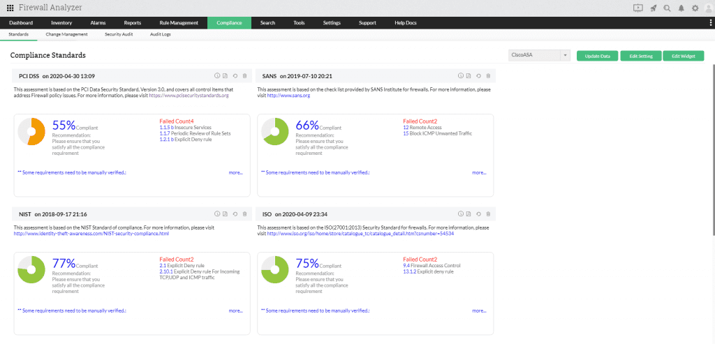 O Network Configuration Manager e o Firewall Analyzer ajudam os administradores de rede a cumprir políticas de compliance específicas do setor , automatizar auditorias de conformidade e manter uma rede totalmente segura. Além disso, os administradores podem usar estas soluções para: