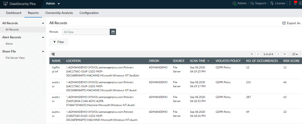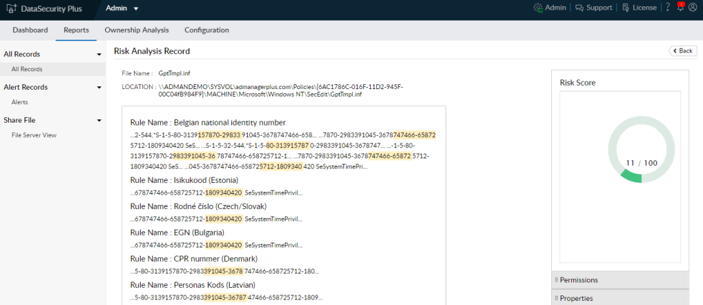 Por isso recomendamos o uso do Data Security Plus da ManageEngine para monitoramento desses dados. Podemos definir políticas e vincular regras como identificação de RG, CPF, Telefone, E-mail ou qualquer parâmetro se desejar. Assim, durante a varredura caso a solução encontre algum dos padrões definidos você receberá um alerta e pode interceptar qualquer ação previamente.