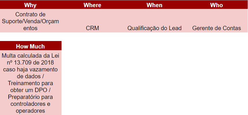 Com a metodologia 5W2H conseguimos definir um step by step com o por quê precisamos daquele dado e até quanto isso irá custar caso haja algum problema que não esteja em compliance com a LGPD.